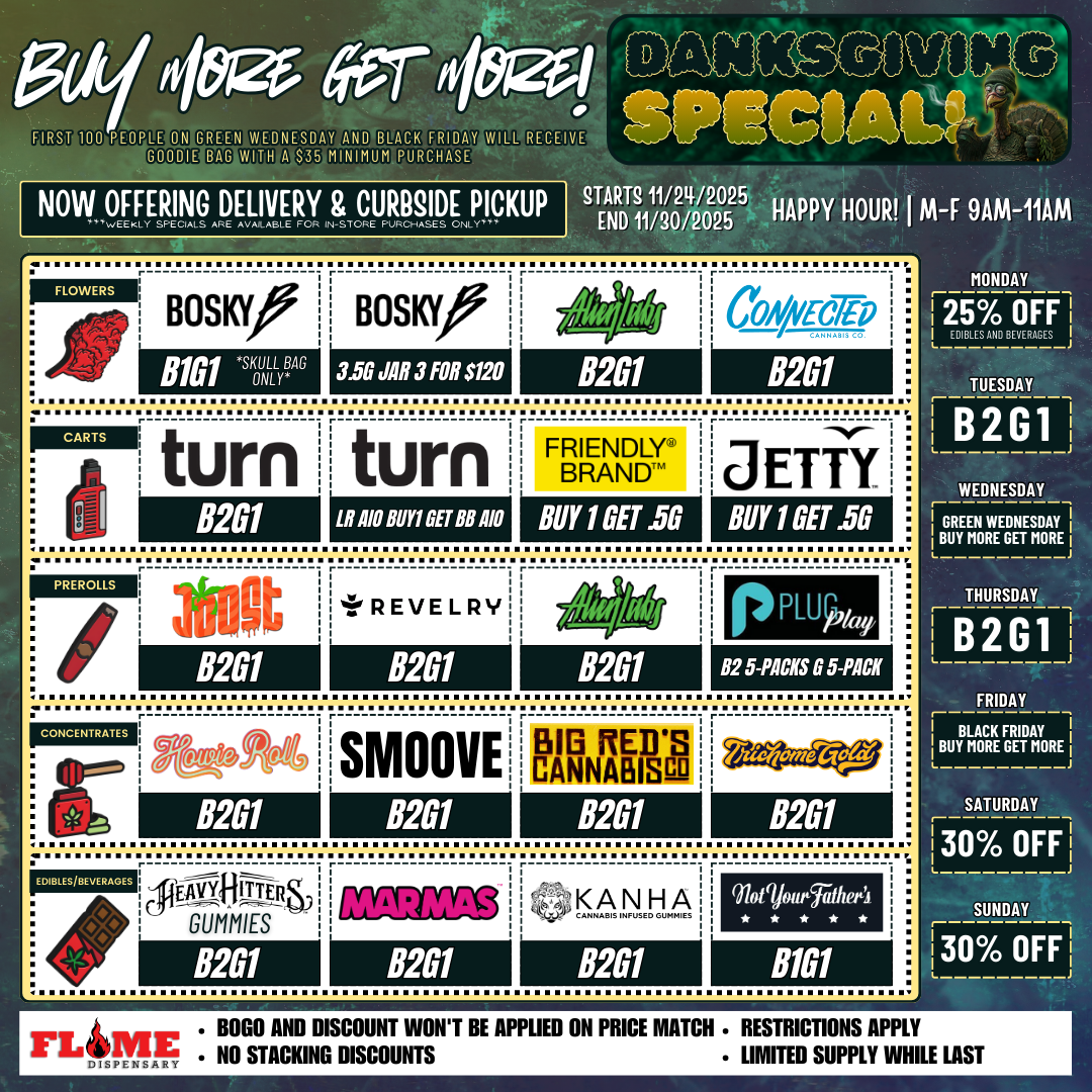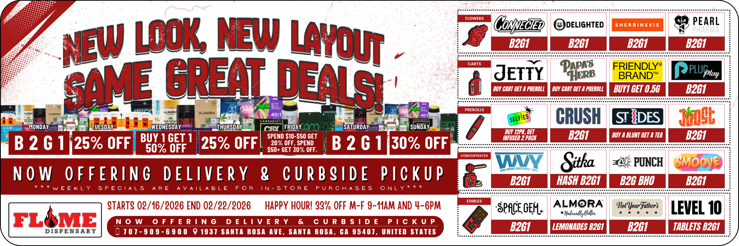 Flame Dispensary, located in Santa Rosa, CA, proudly offers a curated selection of premium cannabis products. Explore our diverse menu featuring top-quality strains, flowers, concentrates, edibles, and more. At Flame Dispensary, we’re dedicated to providing accessible and exceptional cannabis experiences.